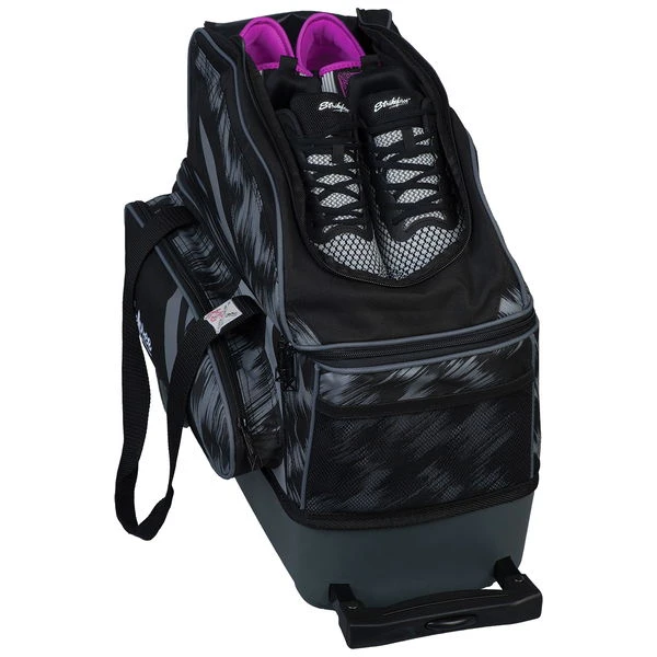 Designed and assembled in the USA, the KR Strikeforce Cruiser Scratch Double Roller bag is a great bag for couples. With room for two bowling balls, two pairs of shoes, and additional accessories in a large side pocket, you will have everything you need for your next bowling night! With new color-coordinated molded base and urethane wheels, you will sure to roll up to the bowling center in style!